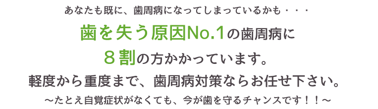 歯を失う原因のNo.1は、虫歯では歯周病です。そして、日本人の8割が既に歯周病にかかっていると言われています。しかし、多くの人は自分が歯周病だと気がついていません。